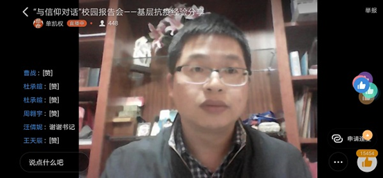 为进一步宣传贯彻党中央、上级部门和学院党委关于疫情防控工作的重要部署,把思想政治教育工作优势转化为强大的战“疫”力量,系邀请虎鹿镇党委书记单凯权同志开展《基层抗疫经验分享》为主题的线上讲座。本次活动由学院党委委员张正亮同志主持,系全体师生参与学习。