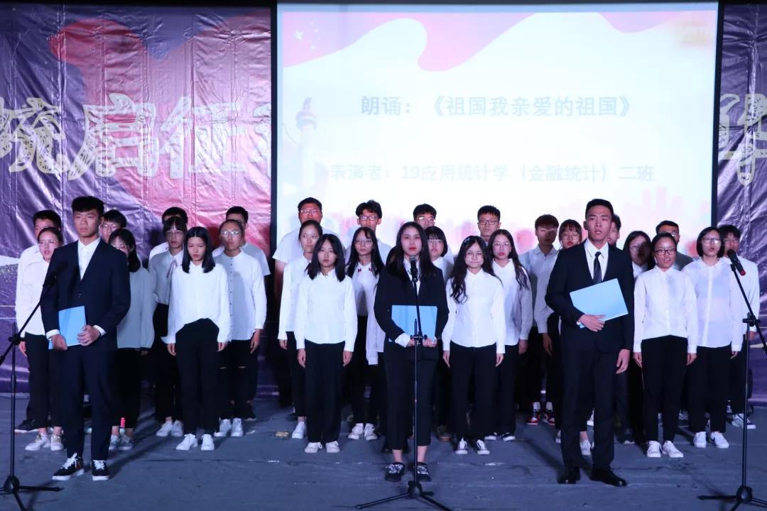 19应用学( 金融)二班的同学们献上《祖国,我亲爱的祖国》,用激昂地朗诵为祖国母亲编织一身彩霞,用青春热血为祖国的熊熊火光添薪,迸发出中华儿女的豪气与身为龙的传人的胆魄。