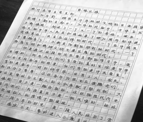 团总支学生会以信笺歌颂祖国。学子以中华传统文化中充满人文气息的软笔书写形式,浓墨重彩致敬新时代。在宣纸上写下一行行自己对祖国的心里话,致敬哺育和培养他们的伟大祖国母亲。
