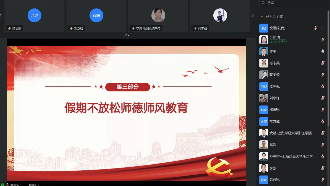 会议第三项,党支部书记罗平组织开展师风师德警示教育,他提醒各位教师在假期中,一是要潜心问道,勇于探索。保持良好心态,坚持学习,增加专业知识和通用知识储备,在学习中不断提高知识水平和工作能力,树立终身学习理念,始终保持学习状态,为新学期的工作做好充分准备;二是要坚持言行雅正,为人师表。以身作则,举止文明,作风正派,自重自爱;三是要铭记职责,身体力行。度过一个安全、健康、充实、快乐、廉洁的假期。沉淀心灵,滋养思想,规律作息,调整身心,以饱满的状态迎接新学期的到来。
